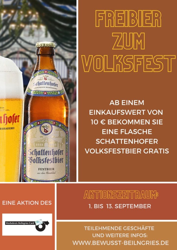 Zum Beilngrieser Volksfest gibts es bei ausgewählten Geschäften ab einem Einkaufswert von 10 € eine Flasche Schattenhofer Volksfestbier gratis dazu.